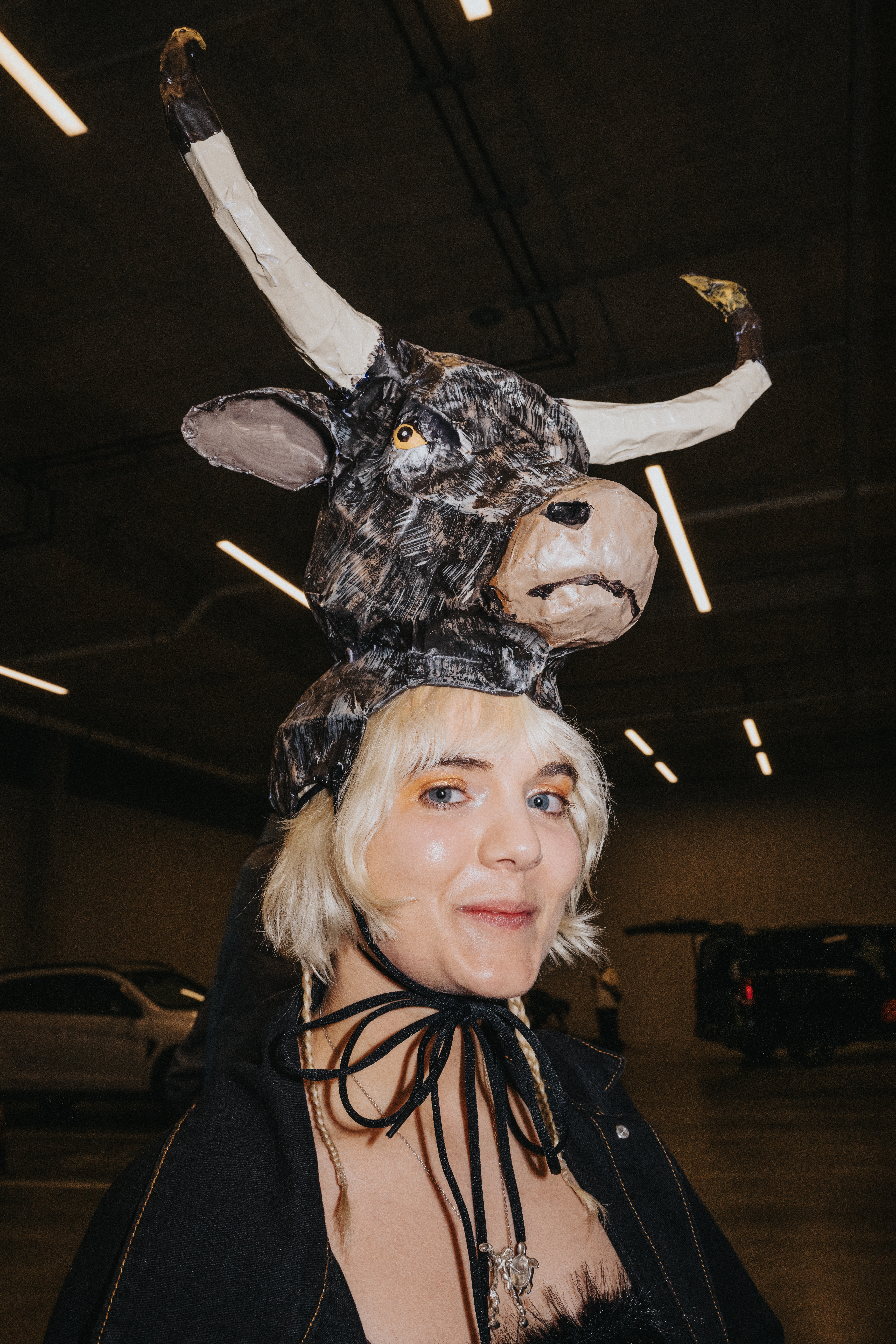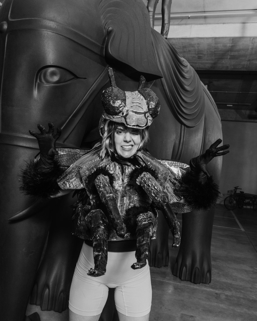 Half fly, half woman, paper mache, faux fur, bike helmet, 2025