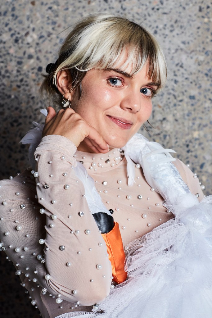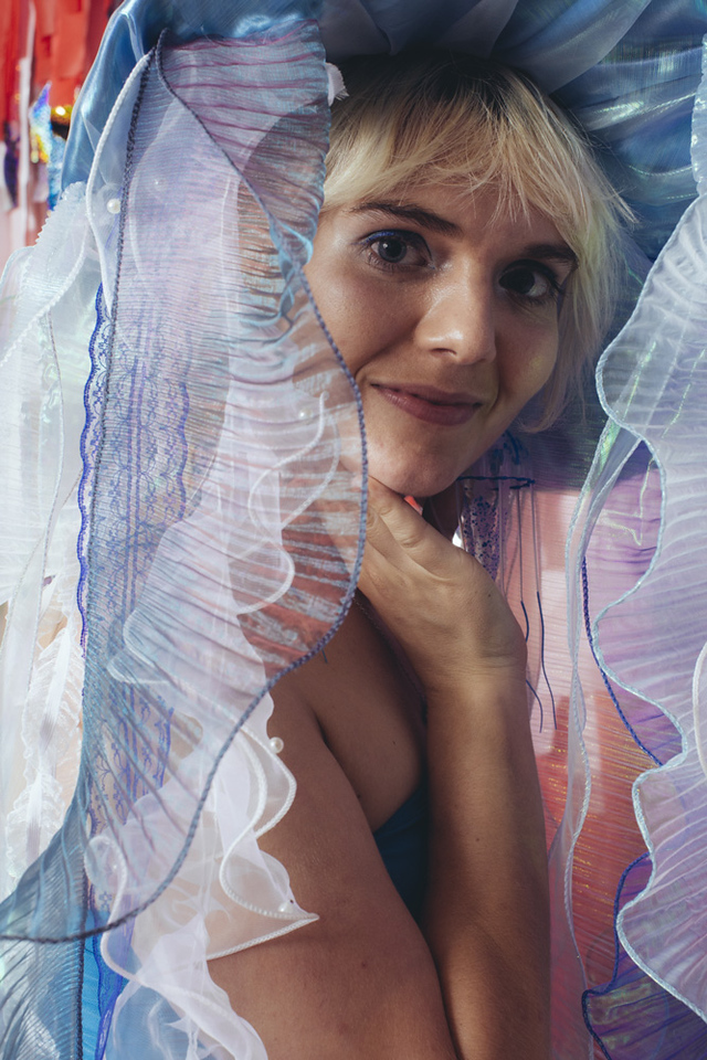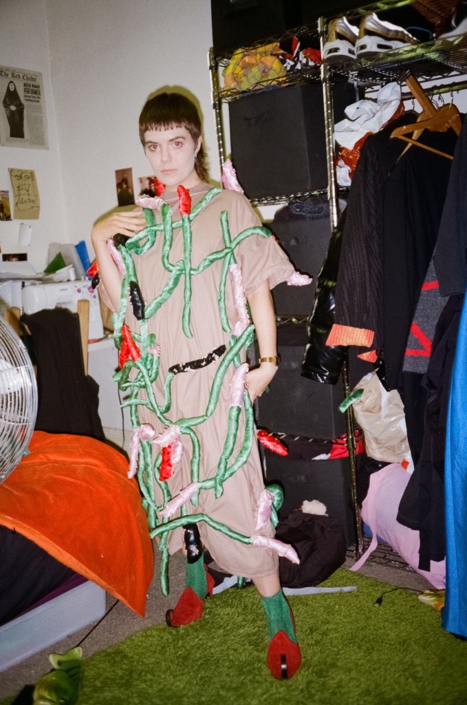 Bjork swan dress, fabric, mesh, beads, plastic bags, 2021