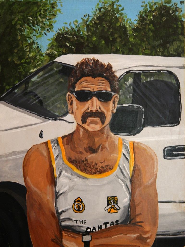 Jeff and his Hilux, acrylic paint on wood panel, 405mm x 305mm, 2022