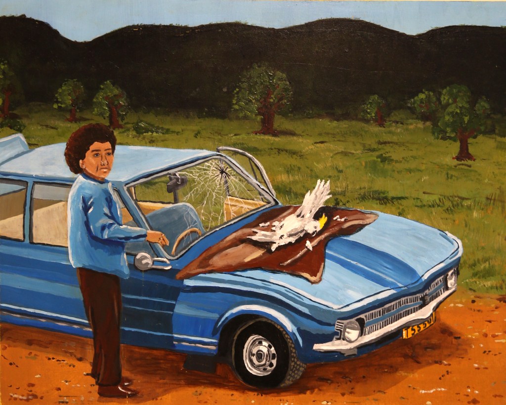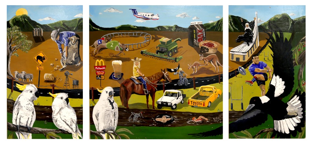 Vera hit a cocky in the countryside, acrylic paint on wood panel, 405mm x 510mm, 2022