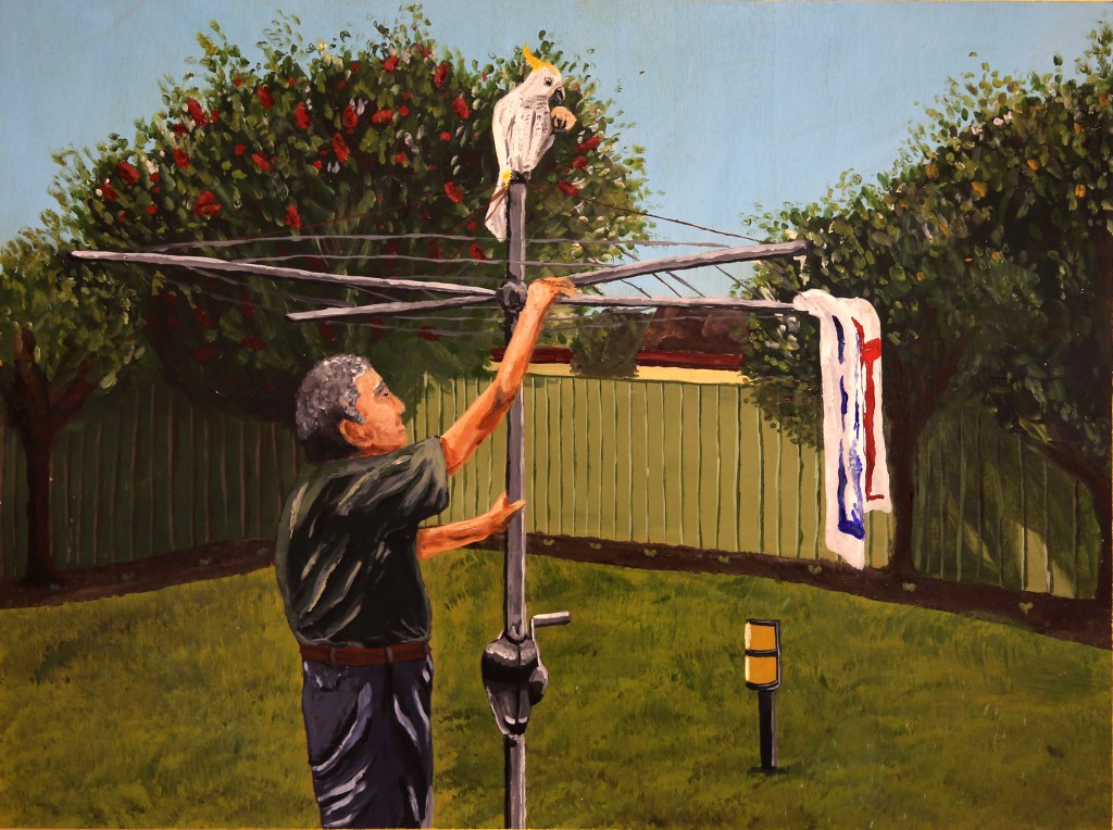 Grandad Jack feeding a cocky a sao, acrylic paint on wood panel, 460mm x 610mm, 2022