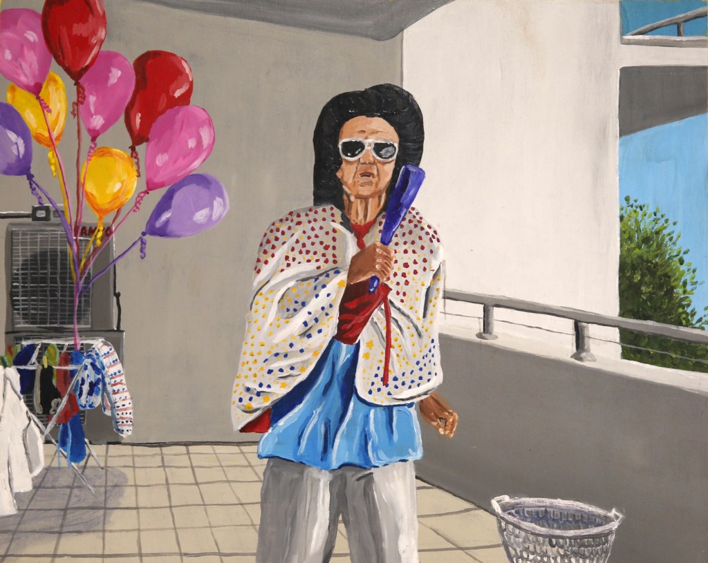 Ma dressed as Elvis on her 80th birthday, acrylic paint on wood panel, 405mm x 510mm, 2022