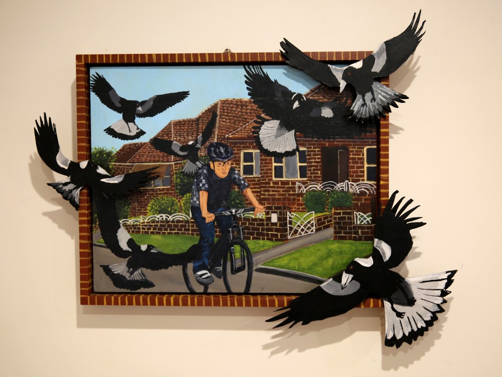 Swooping Season, acrylic paint on canvas, mixed media, 580mm x 750mm, 2022