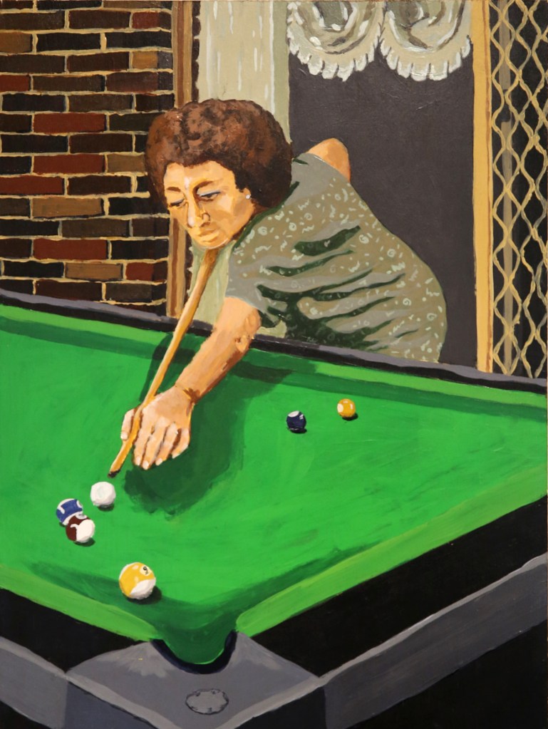 Vera playing pool, acrylic paint on wood panel, 405mm x 305mm, 2022